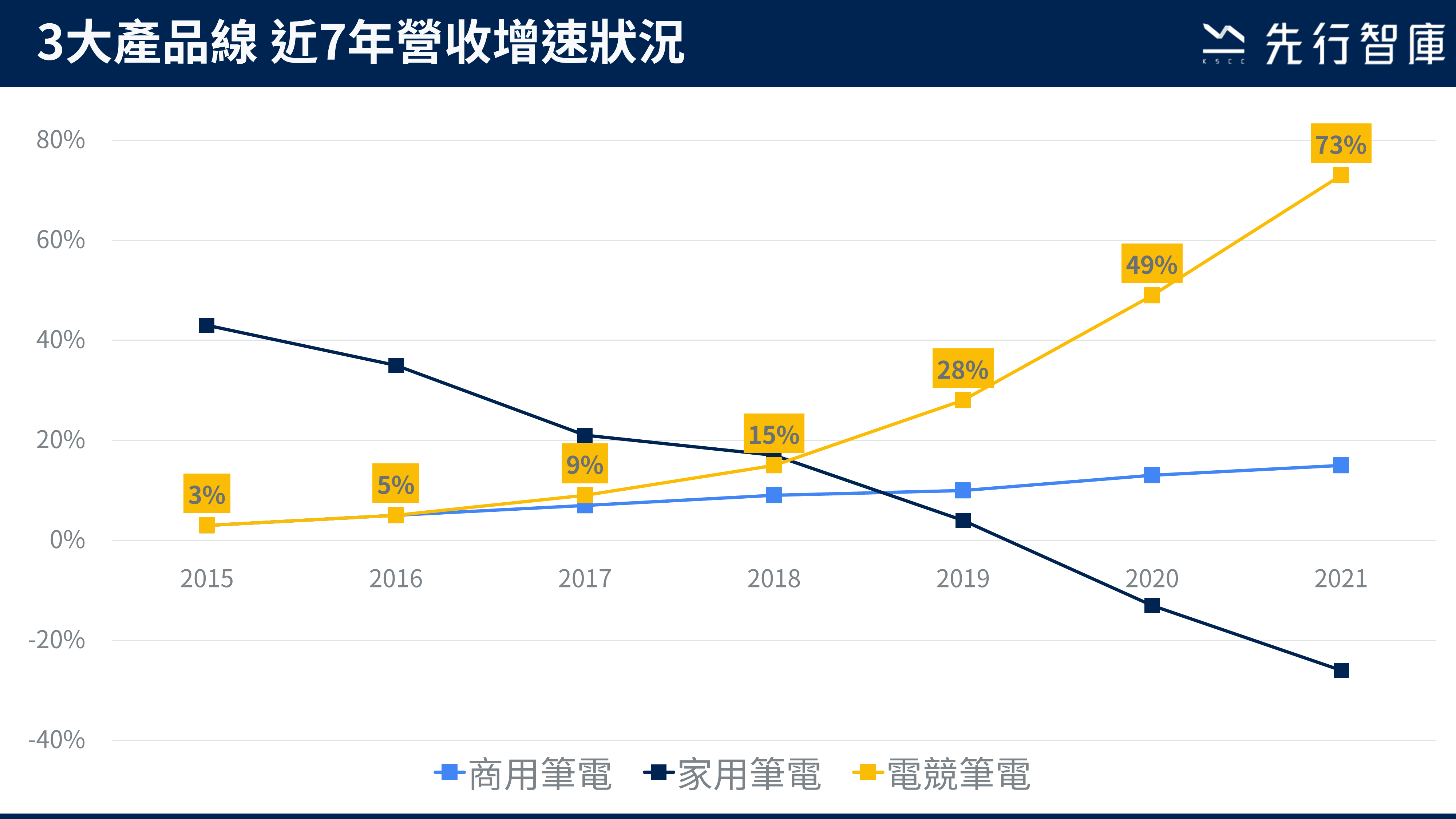 我們可以將YoY的數據,繪製成折線圖,以了解每個產品線的營收增速狀況。這個範例中,我們就可以得知電競筆電的營收,一年筆一年賺錢,甚至越賺越多。商業筆電也是類似狀況,不過賺錢的速度沒有電競筆電來的快。反觀家用筆電,則是呈現衰退情形。透過下圖,我們就一目瞭然,電競筆電是公司的明星產品。