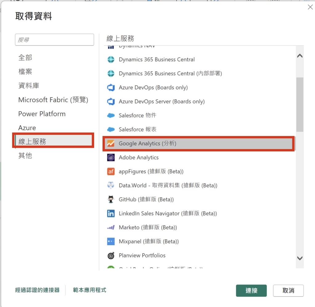 自今年7月1日起,Google將全面暫停處理通用版Google Analytics(GA3)的資料收集,讓使用者轉移到Google Analytics 4(簡稱GA4),對此Power BI也正式支援GA4的資料串接,使得數位行銷人員,也能無痛匯入資料集,進一步製作可視化報表。依照以下步驟串接資料集「取得資料>線上服務>Google Analytics(分析)>2.0(搶先版beta)」。