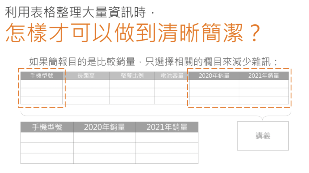 或是你也會疑惑,這些資訊雖然未必有關,但是也花了時間力氣去搜集整理,把它們排斥在外豈不是浪費了你的準備,也讓觀眾看不出你的努力?其實,這個額外欄位可以保留在講義或是簡報後的附加檔案中,你的努力不會白費的,大前提仍然是把訊息帶到觀眾的心裡,未能對此有幫助的資訊,一概從表格移除。